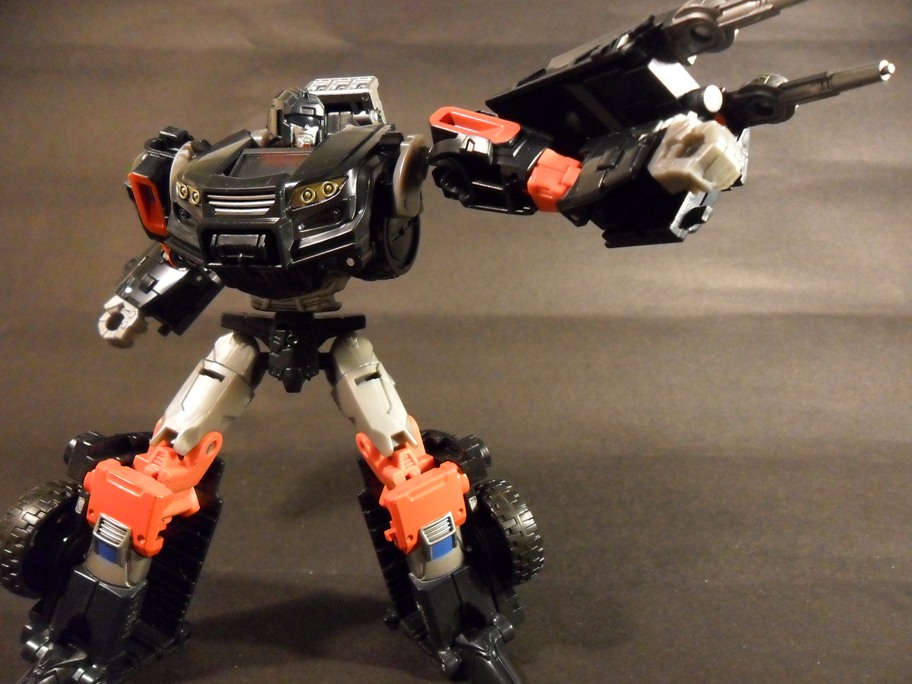 Rather than a modern pickup truck, the alt mode looks more like an armored pickup truck (based on the side window). The truck bed canopy is removable (forming his Battle Shield in robot mode)